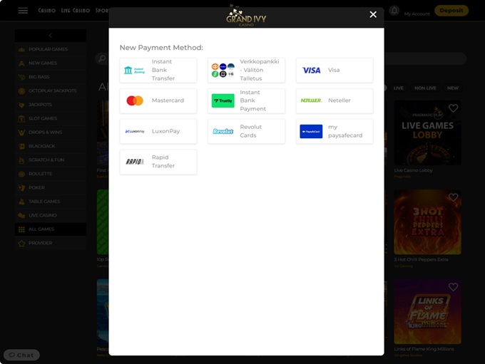 The Grand Ivy Casino supports banking methods for deposits and withdrawals for Apple Pay, MasterCard Credit, Visa Credit, Maestro, PayPal, Paytrail, Bank Wire Transfer, Google Pay, MasterCard Debit, Luxon Pay