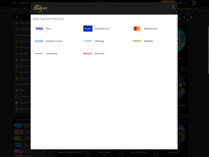 The Grand Ivy Casino supports banking methods for deposits and withdrawals for Apple Pay, MasterCard Credit, Visa Credit, Maestro, Paytrail, Bank Wire Transfer, Google Pay, MasterCard Debit