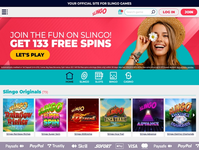 A celebration of fun awaits on the landing page with a confetti of gaming titles on display, each packed with their own set of pays and bonuses. Occupying the top spot is the 40+ Slingo titles with details on how to play and win stamped to each one. There are quick links to other gaming options such as slots, bingo and casino plus a promotional banner with the latest welcome offer. Payment options rotate between the games just above the daily jackpots, promotions and blog posts.
