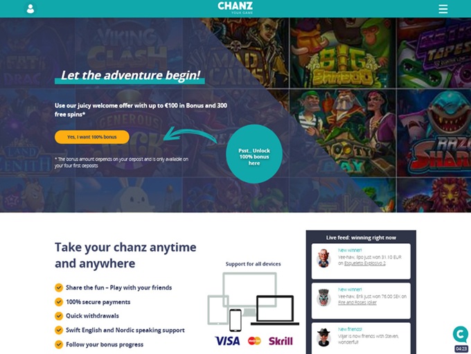 Claim the Welcome Bonus Package at Chanz Casino Consisting of up to €100 + 300 Extra Spins