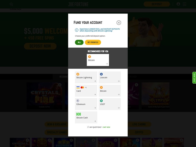 Joe Fortune Casino supports banking methods for deposits and withdrawals for Bitcoin, Bitcoin Cash, Litecoin, MasterCard Credit, Visa Credit, Ethereum, American Express, Bank Wire Transfer, Tether
