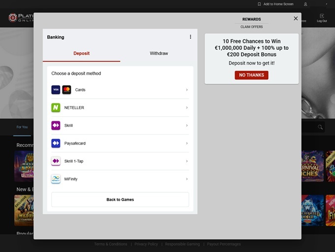 Platinum Play Casino supports banking methods for deposits and withdrawals for MasterCard Credit, Visa Credit, Maestro, Visa Debit, Visa Electron, MasterCard Debit, eCheck, Bank Wire Transfer, USD Coin, Google Pay