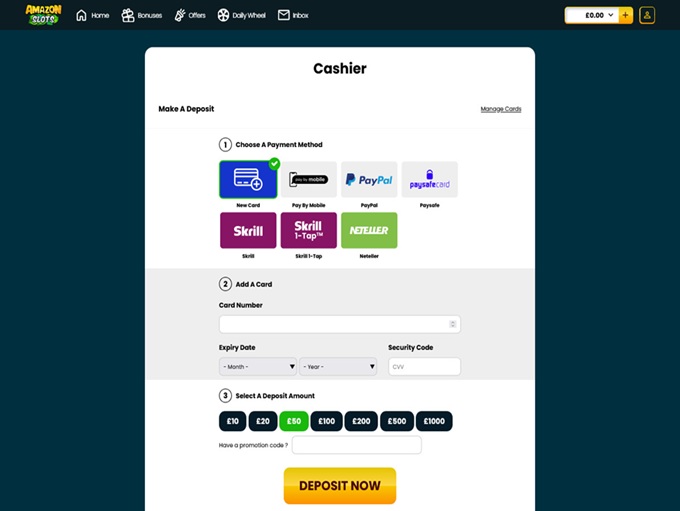 Amazon Slots supports banking methods for deposits and withdrawals for MasterCard Credit, Visa Credit, Maestro, Visa Debit, MasterCard Debit, Bank Wire Transfer