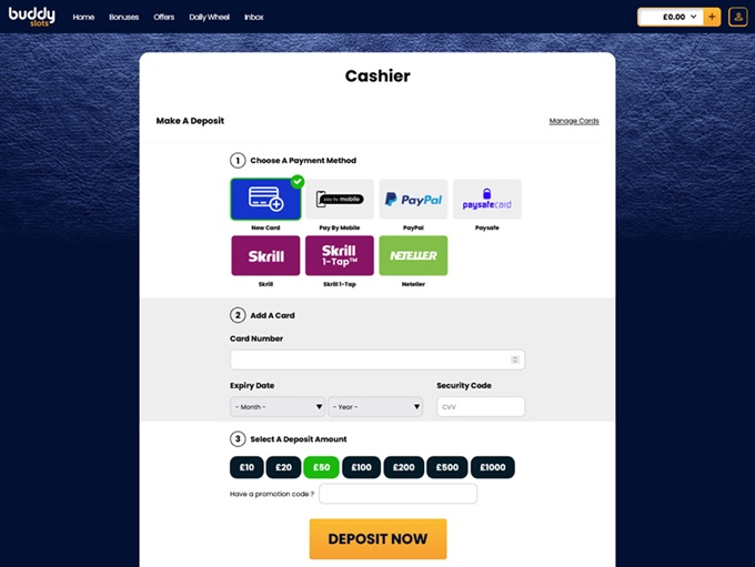 Buddy Slots supports banking methods for deposits and withdrawals for Maestro, MasterCard Credit, Visa Credit, Visa Debit, MasterCard Debit, Bank Wire Transfer
