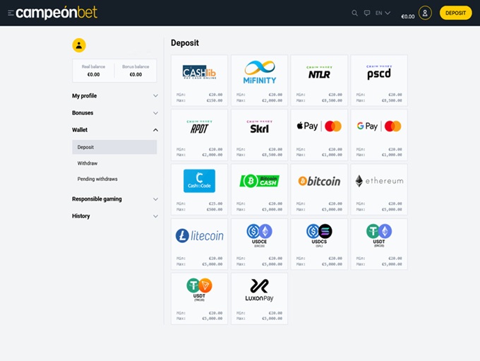 Campeonbet Casino supports banking methods for deposits and withdrawals for Visa Credit, American Express, MasterCard Credit, Bitcoin, Litecoin, Ethereum, Bitcoin Cash, Ripple, Tether, USD Coin, Bank Wire Transfer, MasterCard Debit