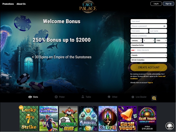 In 2006, TD Investments Ltd took the iGaming scene by storm, birthing the enchanting online gambling realm known as Lake Palace Casino, fully licensed by Kahnawake (KGC) and Curacao gaming authorities. This operator is a part of the well-known Grand Prive Group which runs several other brands, including Jupiter Club Casino, and mostly caters to players located in the USA and Canada. Over the years, this platform has carved its niche in the industry, boasting a simplicity in design that echoes through a navigation menu featuring only two captivating options: promotions and about us. Games, an entire universe, await exploration on the home page.
