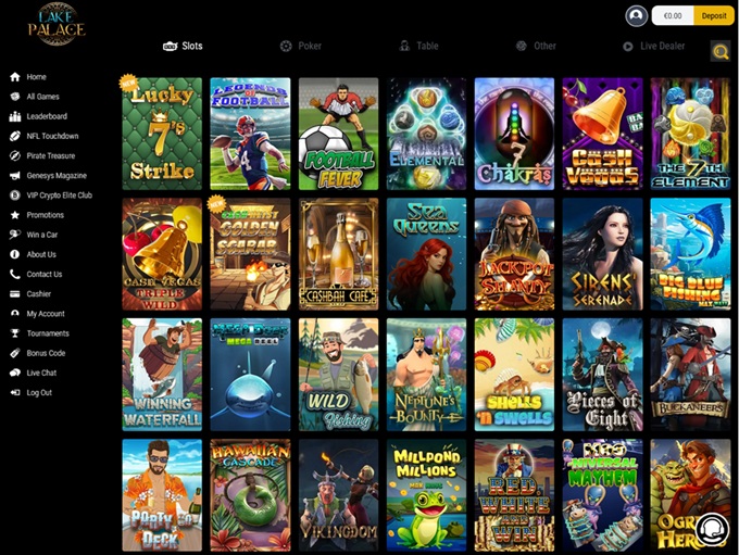 Within this digital haven, the homepage header not only showcases the jackpot spectacle but also extends a welcome in multiple languages. With six language options, including French and German, Lake Palace ensures a global embrace for its diverse audience.