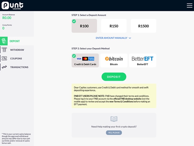 Bitcoin and Rand serve as the primary banking methods supported. Other details in this category you should be aware of include withdrawal limits that are dependent on your player class and long withdrawal processing times, which can take up to 10 business days.