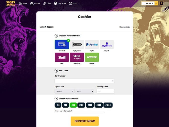 Slots Animal Casino supports banking methods for deposits and withdrawals for Maestro, MasterCard Credit, Visa Credit, Visa Debit, MasterCard Debit, Bank Wire Transfer