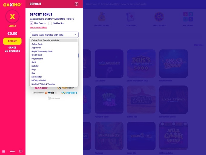 Caxino Casino supports banking methods for deposits and withdrawals for MasterCard Credit, Visa Credit, Bank Wire Transfer, Apple Pay