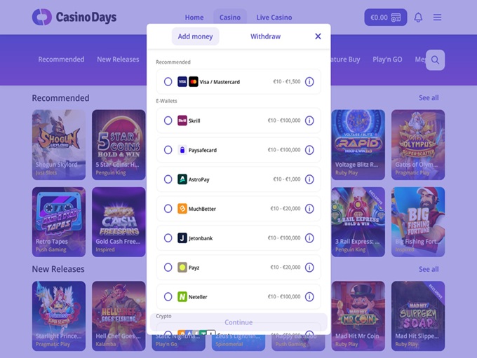Casino Days supports banking methods for deposits and withdrawals for MasterCard Credit, Visa Credit, Visa Debit, MasterCard Debit, Bitcoin Cash, Tether, Diners Club Credit, Discover, Bitcoin, Litecoin, Ethereum, Ripple, Google Pay, Bank Wire Transfer, TRON, Solana, USD Coin