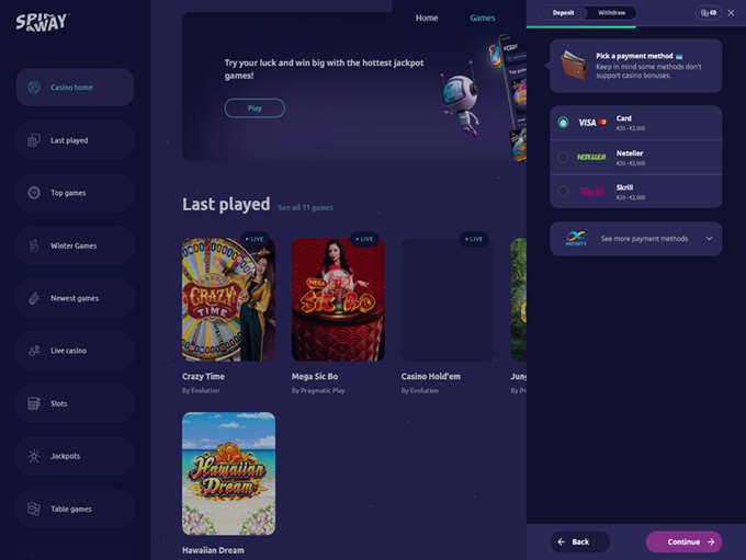 SpinAway supports banking methods for deposits and withdrawals for MasterCard Credit, Visa Credit, Bitcoin, Litecoin, Bitcoin Cash, Ripple, Ethereum, Dash, Bank Wire Transfer, Visa Debit, MasterCard Debit, Tether, USD Coin