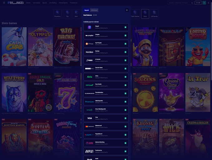 One of the better aspects of playing at Frumzi are its fast payouts. Deposits are also processed immediately, when made through digital wallets and credit/debit cards.