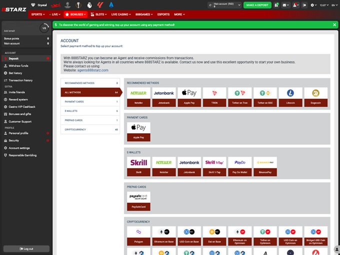 888STARZ supports banking methods for deposits and withdrawals for MasterCard Credit, Visa Credit, WebMoney, Bitcoin, Litecoin, Ethereum, Bitcoin Cash, Dogecoin, Monero, Ripple, Tether, TRON, Dash, EOS, Cardano, Polkadot, USD Coin, MasterCard Debit, Solana