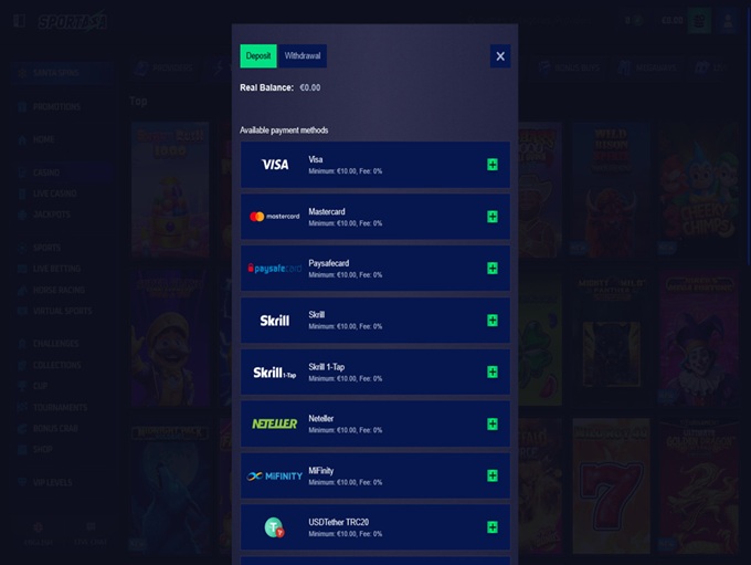 Sportaza Casino supports banking methods for deposits and withdrawals for MasterCard Credit, Visa Credit, Bitcoin, Litecoin, Ethereum, Ripple, Bank Wire Transfer, MasterCard Debit, Bitcoin Cash, USD Coin