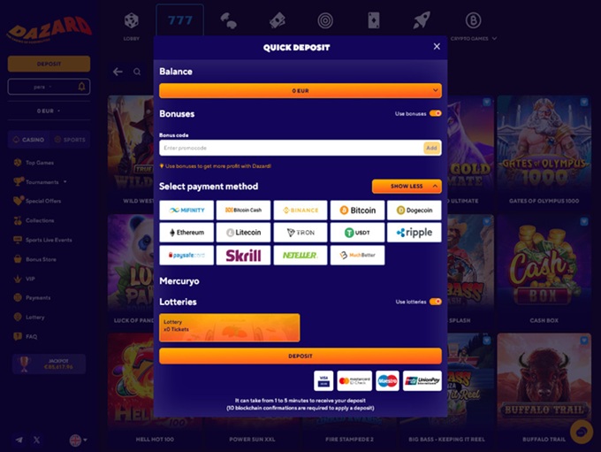 Dazard Casino supports banking methods for deposits and withdrawals for Maestro, MasterCard Credit, Visa Credit, Bitcoin, Litecoin, Ethereum, Bitcoin Cash, Dogecoin, Tether, TRON, Cardano, Bank Wire Transfer, Ripple, Neo