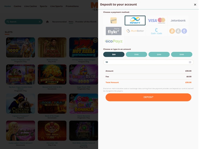 MoiCasino supports banking methods for deposits and withdrawals for MasterCard Credit, Visa Credit, Bitcoin, Litecoin, Ethereum, Bitcoin Cash, Bank Wire Transfer, Cardano, Dogecoin, TRON, Tether, Ripple