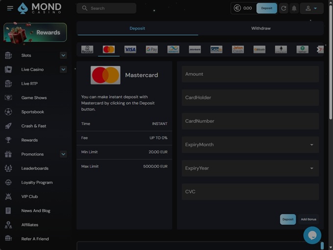 MondCasino supports banking methods for deposits and withdrawals for Bitcoin, Litecoin, Ethereum, Bitcoin Cash, Monero, Ripple, Tether, TRON, Visa Credit, MasterCard Credit, Bank Wire Transfer, Dogecoin, Apple Pay, Google Pay, USD Coin, Instant Bank, Solana