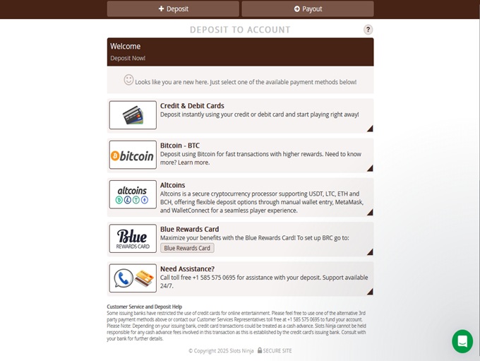 Slots Ninja Casino supports banking methods for deposits and withdrawals for American Express, Bank Wire Transfer, Check/Cheque, Diners Club Credit, Discover, MasterCard Credit, Visa Credit, Visa Debit, Bitcoin, Litecoin, Ethereum, Bitcoin Cash, MasterCard Debit, Blue Rewards Card