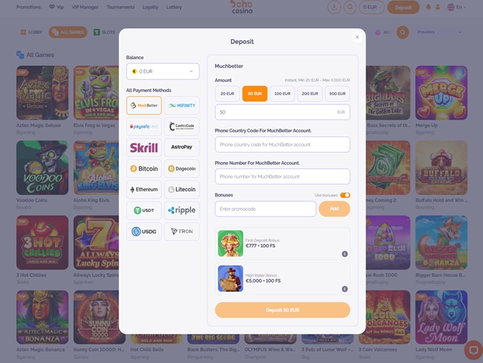 BOHO Casino supports banking methods for deposits and withdrawals for Maestro, Visa Credit, Bitcoin, Bitcoin Cash, Ethereum, Litecoin, Dogecoin, Tether, Ripple, MasterCard Credit, Bank Wire Transfer