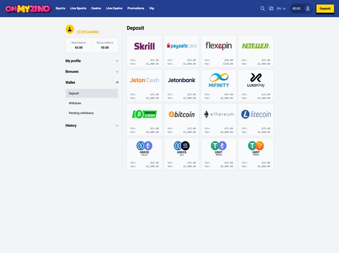 OhMyZino Casino supports banking methods for deposits and withdrawals for MasterCard Credit, Visa Credit, Bitcoin, Bitcoin Cash, Ethereum, Litecoin, Bank Wire Transfer, Tether, MasterCard Debit, Luxon Pay