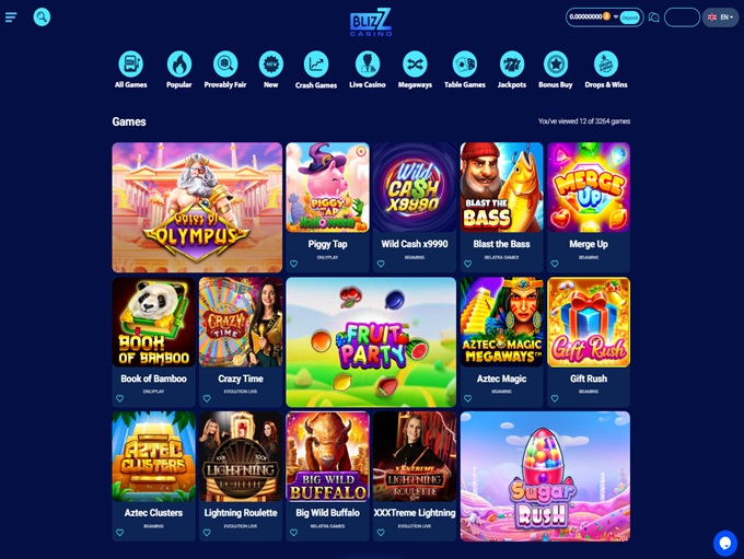The top menu provides an access to the casino and live casino gaming libraries. From there you can also enter the promotions page, as well as info on Blizz Casino’s latest tournaments.