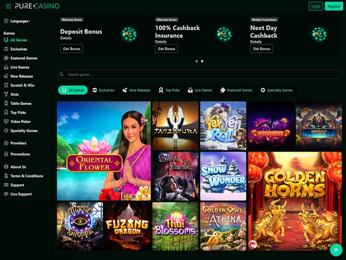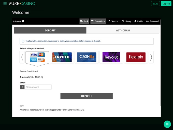 Pure Casino supports banking methods for deposits and withdrawals for Visa Credit, MasterCard Credit, American Express, Discover, Bitcoin, Bank Wire Transfer, Litecoin, Tether, Ethereum, USD Coin