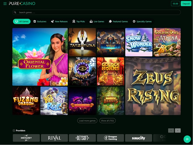 Pure Casino accepts the following currencies: Bitcoin, Ethereum, Euro, U.K. Pounds, Litecoin, Tron, US Dollars, USD Coin, Tether, South African Rand