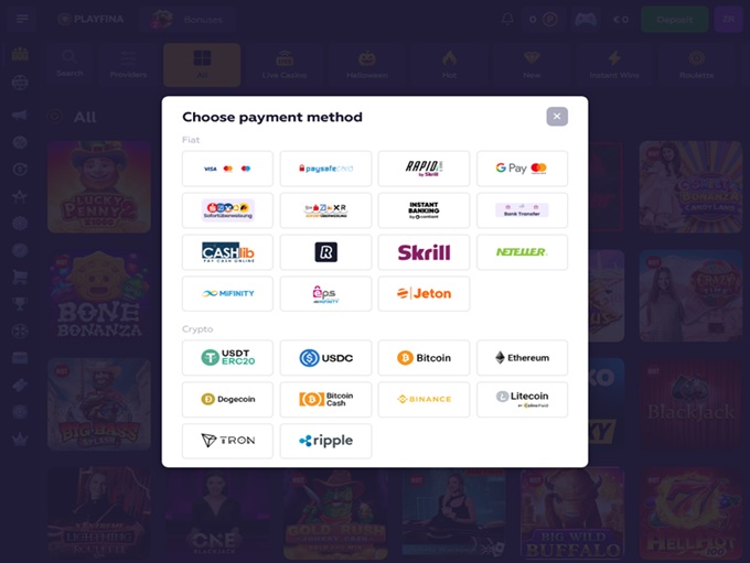 Playfina Casino supports banking methods for deposits and withdrawals for Visa Credit, MasterCard Credit, Bitcoin, Bitcoin Cash, Ethereum, Litecoin, Dogecoin, TRON, Ripple, Cardano, Tether, Maestro, Bank Wire Transfer, MasterCard Debit, Apple Pay, Skinsback