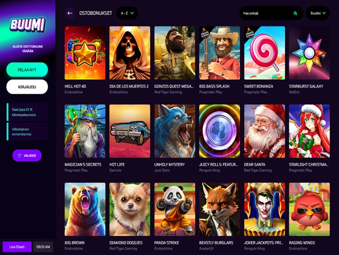 The emphasis is definitely on slot games here at Buumi casino. This category is the broadest with several thousand titles. This means it is packed with games of various themes such as fruits, animals, pots, bonanzas…