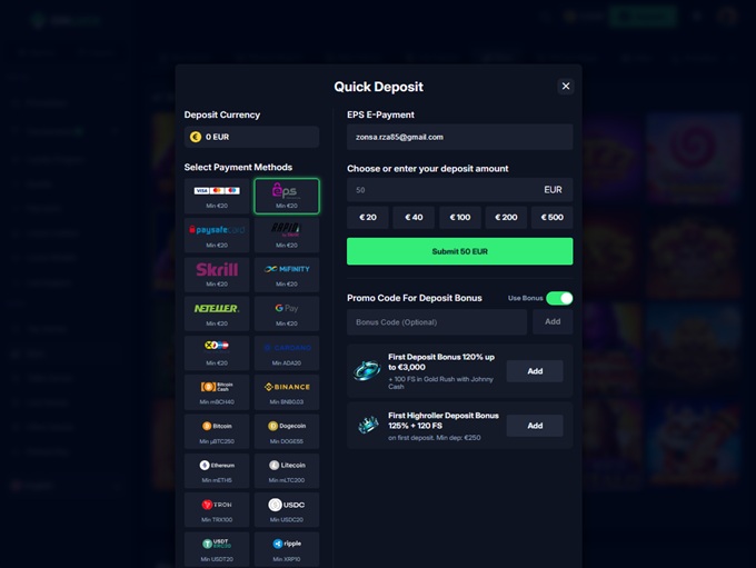 - The casino offers a wide range of currencies, both fiat and crypto, including EUR, USD, BTC, CAD, DODGE, ETH, TRX, and more.