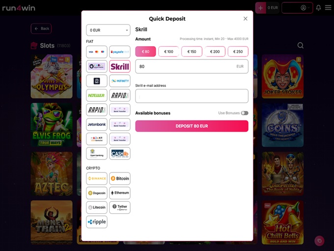 Run4Win Casino accepts the following currencies: Cardano, Brazilian Real, Bitcoin, Canadian Dollars, Dogecoin, Ethereum, Euro, Japanese Yen, Litecoin, Norwegian Krone, New Zealand Dollars, Polish Zloty, Russia Rubles, US Dollars, Tether, Ripple