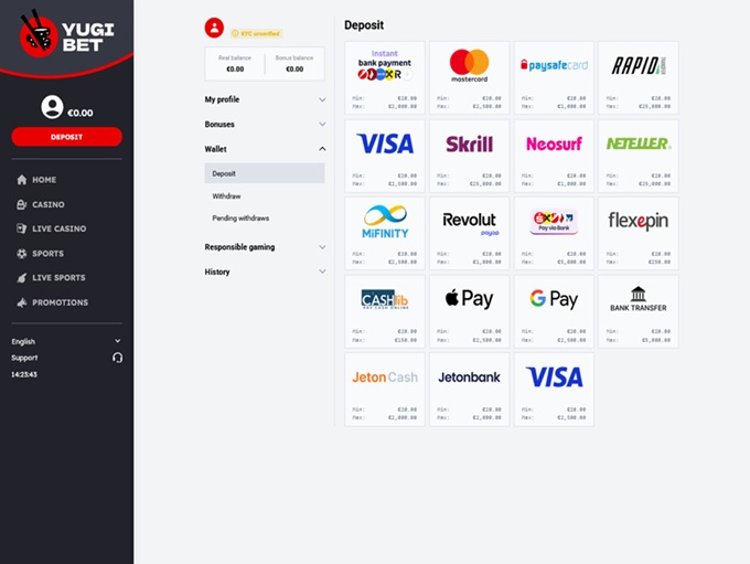 Yugibet Casino supports banking methods for deposits and withdrawals for MasterCard Credit, MasterCard Debit, Bank Wire Transfer