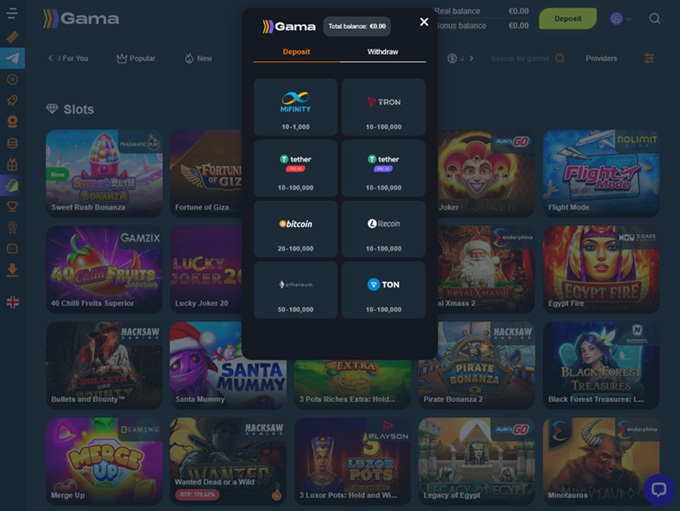 GamaCasino supports banking methods for deposits and withdrawals for Visa Credit, MasterCard Credit, MasterCard Debit, Bitcoin, Ethereum, Litecoin, Tether, Bank Wire Transfer, TRON, Binance