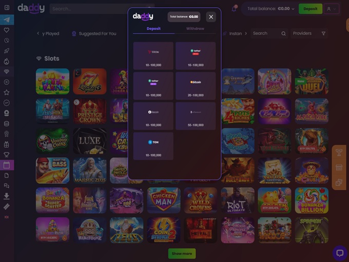 daddy Casino supports banking methods for deposits and withdrawals for Visa Credit, MasterCard Debit, MasterCard Credit, Bitcoin, Ethereum, Litecoin, Tether, TRON, Bank Wire Transfer, Bitcoin Cash, Dogecoin, Binance