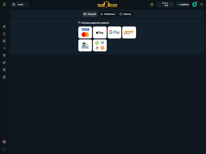 TombRiches Casino supports banking methods for deposits and withdrawals for MasterCard Credit, Bitcoin, Ethereum, Litecoin, Bitcoin Cash, Dogecoin, Tether, USD Coin, Bank Wire Transfer, Ripple, Visa Credit, MasterCard Debit