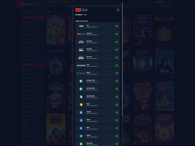 Casinado Casino supports banking methods for deposits and withdrawals for Visa Credit, MasterCard Debit, MasterCard Credit, Bank Wire Transfer, Tether, Bitcoin, Litecoin, Ethereum, USD Coin, Dogecoin, Solana, TRON