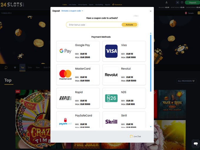 24Slots Casino supports banking methods for deposits and withdrawals for Visa Credit, MasterCard Debit, MasterCard Credit, Ripple, Ethereum, Bitcoin, Litecoin, Tether, Maestro, Visa Electron, Bitcoin Cash, Apple Pay, USD Coin, Bank Wire Transfer