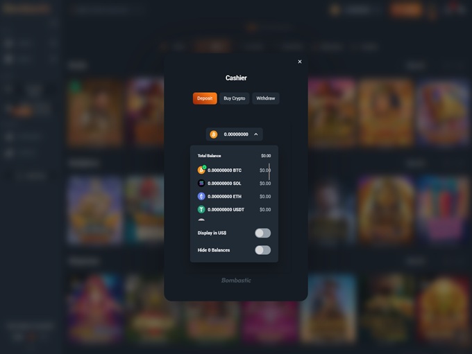 Bombastic Casino supports banking methods for deposits and withdrawals for Bitcoin, Ethereum, Tether, Bitcoin Cash, TRON, Ripple, Litecoin, Dogecoin, USD Coin