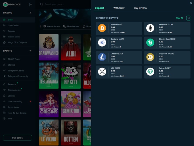 Megadice Casino supports banking methods for deposits and withdrawals for Bitcoin, Bitcoin Cash, Dogecoin, Tether, Solana, Ripple, Ethereum, Litecoin, USD Coin, TRON, Cardano