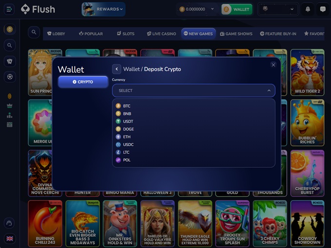Flush casino focuses on cryptos and the transactions are done in multiple crypto currencies, the most famous one is Bitcoin but there are a few others you can use!