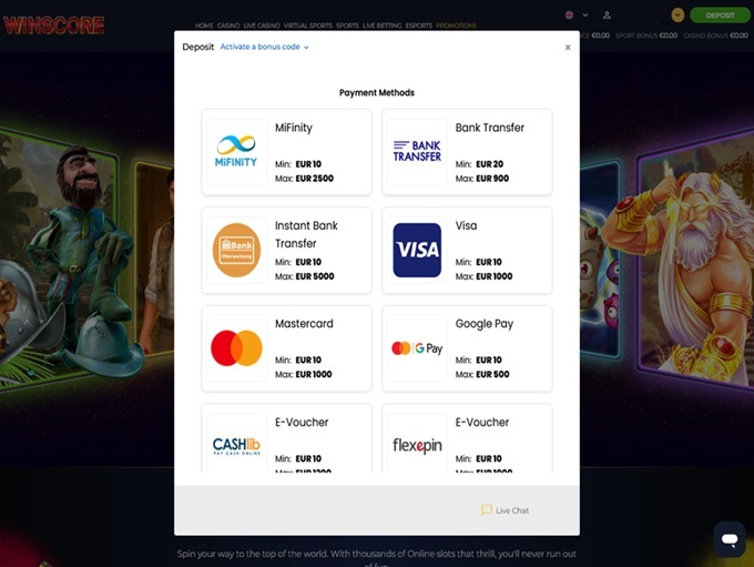 The flexibility of this place is also reflected in the range of available banking methods. Winscore offers a wide selection of options for deposit and withdrawal; offering multiple options to customers who use digital currencies, it is one of the favorite places for crypto play. It also, of course, meets the demands of fiat players, traditionalists who use tried and tested methods such as debit and credit cards.