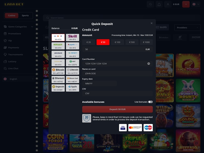 Lamabet Casino supports banking methods for deposits and withdrawals for Bitcoin, Bitcoin Cash, Litecoin, Ethereum, Tether, Dogecoin, Visa Credit, MasterCard Debit, MasterCard Credit, Bank Wire Transfer, Apple Pay, Google Pay, Binance, Ripple