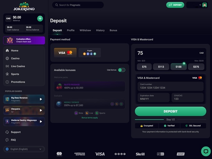 Jokersino Casino supports banking methods for deposits and withdrawals for American Express, Bitcoin, Ethereum, Litecoin, MasterCard Credit, MasterCard Debit, Tether, Visa Credit, Bank Wire Transfer