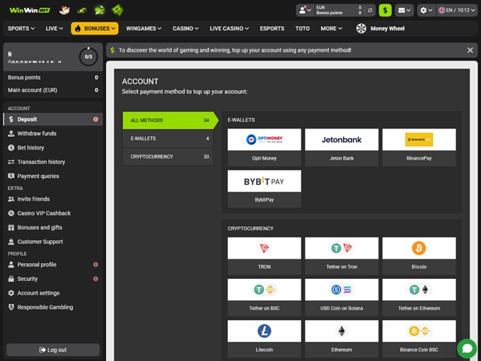 WinWin.Bet Casino supports banking methods for deposits and withdrawals for Dash, Dogecoin, EOS, Ethereum, Litecoin, Monero, Ripple, TRON, Zcash, USD Coin, Tether, Cardano, Bitcoin, Bitcoin Cash, MasterCard Credit, Visa Credit, MasterCard Debit