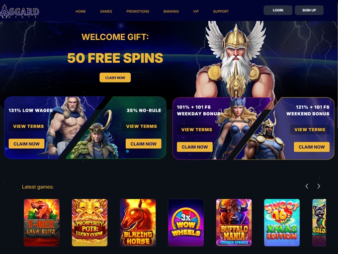 Either way, this is a good-looking platform, and it’s also very easy to use. At the very top of the homepage, we’ll find quick links to Games, Promotions, Banking, the loyalty club, and Support, along with the Login and Sign Up buttons. The middle section is packed with bonus offers and featured games, while the very bottom includes the more serious pages: About, FAQ, Responsible Gambling, Privacy Policy, and Terms and Conditions. So no, we don’t have to be tech geniuses to figure this site out. We’re pretty sure it won’t take more than five seconds to get oriented and feel at home at Asgard Slots.