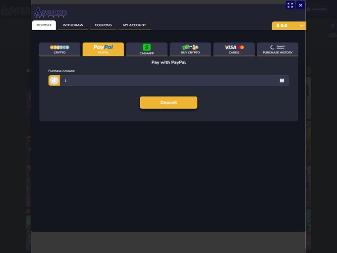 Asgard Slots supports banking methods for deposits and withdrawals for PayPal, Visa Credit, MasterCard Debit, MasterCard Credit, Bitcoin, Solana, Ethereum, Litecoin, Dogecoin, TRON, Tether, Bitcoin Cash, Toncoin, Ripple