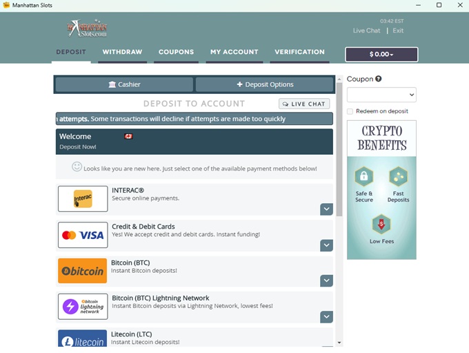 Manhattan Slots supports banking methods for deposits and withdrawals for Bank Wire Transfer, MasterCard Credit, Visa Credit, Visa Electron, American Express, Bitcoin, Diners Club Credit, Discover, MasterCard Debit, Dankort, Litecoin, Bitcoin Cash, USD Coin, Ethereum, Tether, Check/Cheque