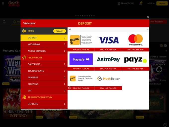 Casino RedKings accepts the following currencies: Brazilian Real, Canadian Dollars, Danish Krone, Euro, U.K. Pounds, Norwegian Krone, US Dollars, South African Rand
