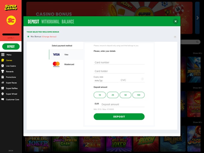 SuperCasino supports banking methods for deposits and withdrawals for MasterCard Credit, PayPal, Bank Wire Transfer, Visa Credit, Apple Pay